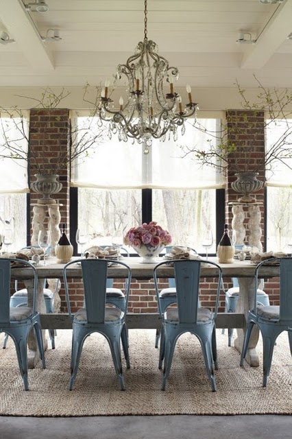 Sticks can be so dramatic and so easy, and will add visual height to a room or vignette! Here they are placed in an urn with a chandelier and vintage tolix chairs.